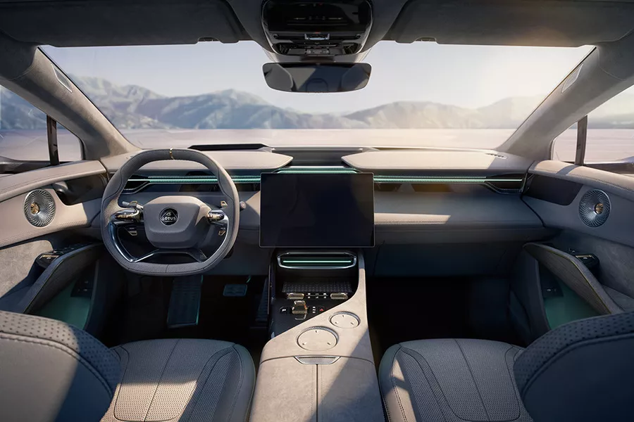Een elektrische Lotus, en een SUV dan nog: oprichter Colin Chapman draait zich waarschijnlijk om in zijn graf... Met diens aloude adagium ‘add lightness’ heeft de meer dan 5 meter lange en 2,5 ton zware Eletre in elk geval niet veel meer te maken. Anderzijds moeten we toegeven dat nooit eerder een Lotus zoveel aandacht had voor de achterste inzittenden en de koffer. In plaats van een driezitsachterbank kun je trouwens ook opteren voor twee afzonderlijke stoelen op de tweede rij. Achter het stuur trekt het grote centrale scherm van 15,3 duim de aandacht. Het vormt een tandem met het digitale instrumentenpaneel en het head-updisplay met augmented reality. De afwerkingskwaliteit is uitstekend.
