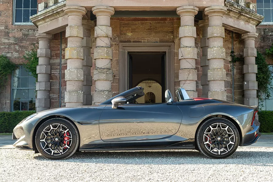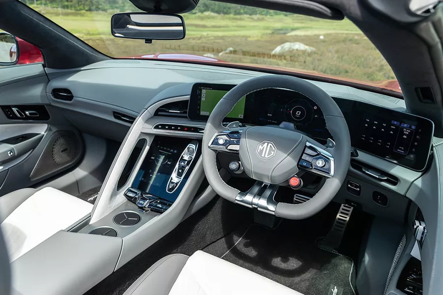 Met de 5 lanceerde MG Europa’s eerste elektrische break, en met de Cyberster pioniert het Chinese merk nu ook bij de elektrische roadsters. Een moderne en vooral emissievrije ode aan de nostalgische kleine MGA en MGB, toen het merk nog onder Britse vlag voer. Nu, met een lengte van 4,54 meter en een breedte van 1,91 meter is de Cyberster groter dan een BMW Z4 en dus allesbehalve compact. Het koetswerk oogt desondanks elegant en rijdt zich met opvallende vlinderdeuren en pijlvormige richtingaanwijzers in de kijker. Binnenin biedt de Cyberster een strakke en bestuurdersgerichte cockpit, voorzien van drie schermen voor de belangrijkste functies én een infotainmentscherm – van het goede wat te veel – én een afwerkingsniveau dat het oude MG nooit kon bereiken. In 15 seconden zet je dat interieur in het zonnetje door de stoffen kap te openen.