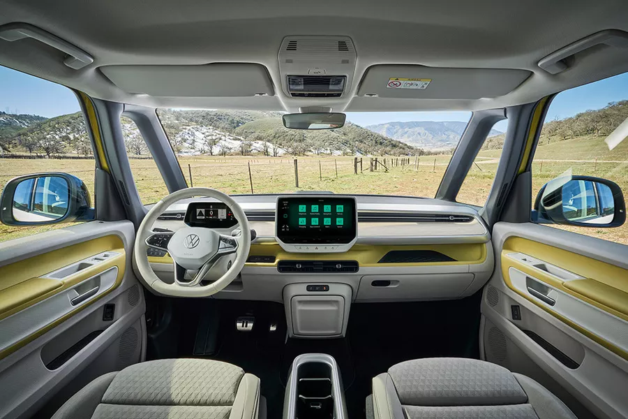 Voorin kijken de inzittenden uit op het dashboard uit de andere ID.-modellen, inclusief die vermaledijde aanraaktechnologie. Het batterijformaat hangt af van de versie. De lange wielbasis is er enkel met de grootste batterij van 86 kWh (en een rijbereik tot 420 kilometer), die met een piekvermogen van 200 kW ook het snelst kan laden. De korte ID. Buzz laat de keuze uit een instapper met een batterij van 59 kWh (331 kilometer) of 79 kWh. Deze laatste vervangt het vroegere pack van 77 kWh, maar voegt niks extra toe aan het rijbereik van 420 kilometer. De sportievere GTX, combineerbaar met beide wielbasissen, lijkt wat misplaatst in deze context, tot je beseft dat er 1.600 in plaats van 1.000 kilo aan de haak kan. De compacte draaicirkel maakt de ID. Buzz aangenaam levendig in de stad, al had de ophanging iets zachter gemogen.